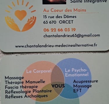 Attentive, douce et à l’écoute, Chantal crée un espace sécurisant où l’on peut déposer ses tensions physiques et émotionnelles. Ses massages et thérapies manuelles visent autant à apaiser les douleurs, qu’à rééquilibrer le corps et favoriser une profonde relaxation.