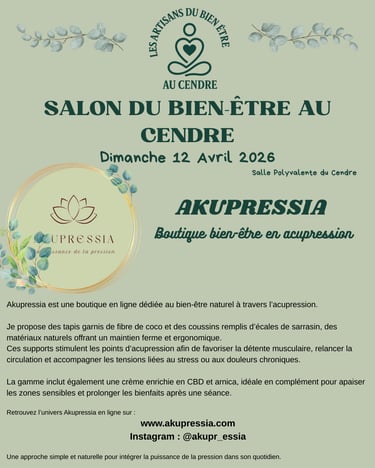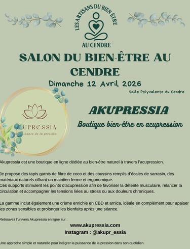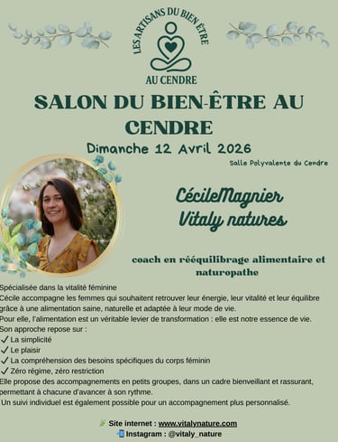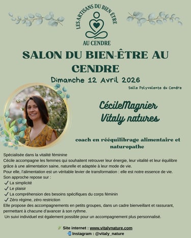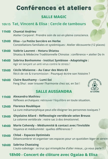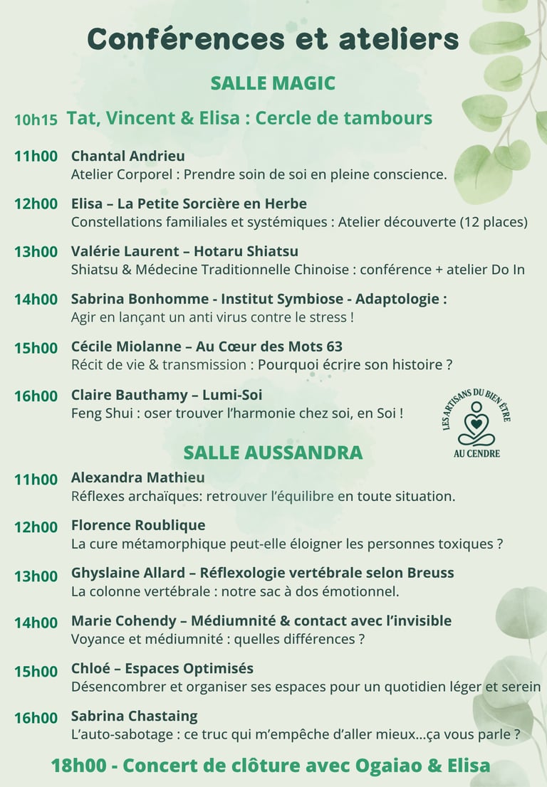 Le Salon du Bien-Être du Cendre vous accueillera de 10h à 18h30 pour une journée placée sous le signe de la détente, de la découverte et du partage 🌿.13 conférences et ateliers seront données sur la journées.