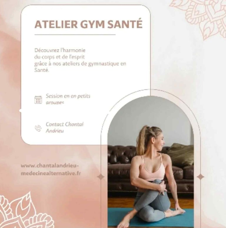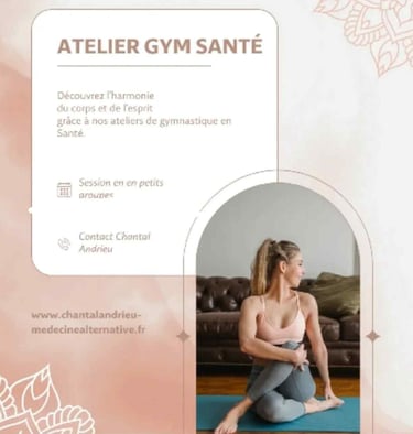 Rejoignez l' Atelier de Gym Santé animé par Chantal Andrieu, masseur-kinésithérapeute déconventionnée et praticienne en santé intégrative depuis plus de 20 ans.